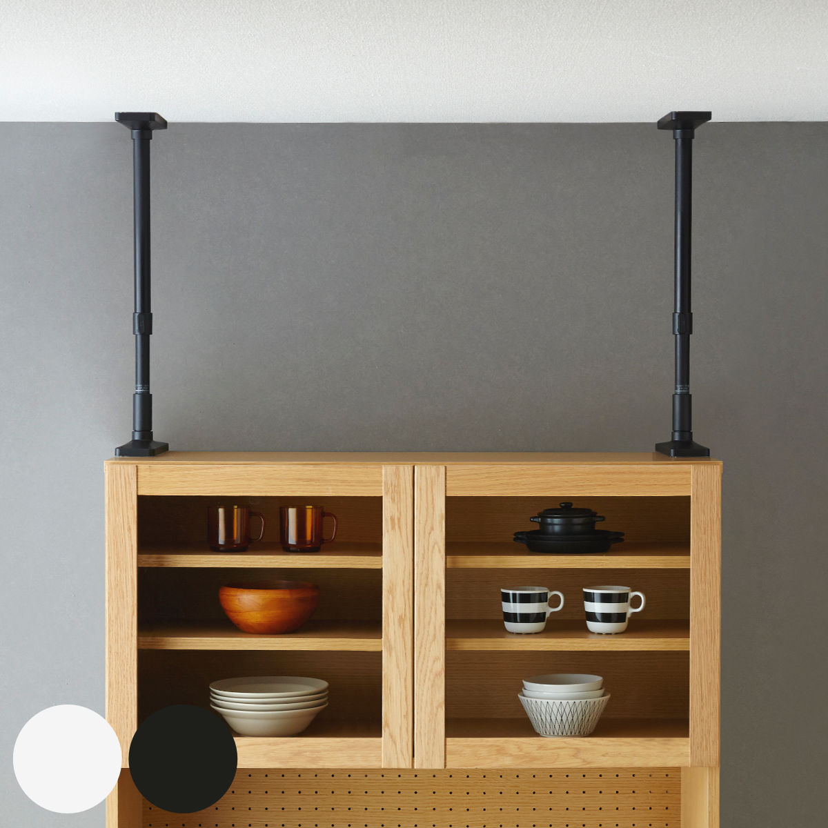 サイズ/約幅7×奥行21×高さ65〜100cm重量/約1.47kg内容量/2本入り材質/パイプ:鉄パイプ、エポキシ樹脂粉体塗装樹脂部品:ABS樹脂・EVA樹脂ねじ類:鉄、メッキ種類/マットホワイト、マットブラック生産国/中国製●地震などによる家具の転倒リスクを減らすための家具転倒防止突っ張り棒です。●家具の天面と天井の間に取り付けることで、家具を固定してすることができます。●ねじ・くぎ不要で取り付けが簡単、石膏ボードや強度の弱い天井にも、市販品等を併用して設置することができます。●震度6強にて耐震性能検証済みです。※東日本大震災の波形を使用●家具転倒防止マットと併用すると、家具の転倒防止効果が上がります。強力 簡単 設置 取り付け 伸縮式 食器棚 本棚 リビング 寝室 安心 家具 転倒防止 地震 天井 防災グッズ 耐震対策 子ども部屋 つっぱりポール 防災用品 災害対策 ホワイト ブラック LH16688