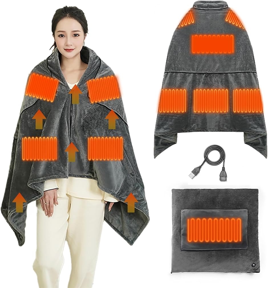 「USB延長コード付き・電気毛布」サイズ:160x80cm、重さ:0.8kg、USB給電の電気毛布。9つの内蔵ヒーター、膝の保護だけでなく、肩にもかけられます。冷えやすい足をカバーできます。昼寝のために腰を温めるベッド毛布としても使えます。冬キャンプ、キャンプ、車、家、オフィスなどに最適です。使う時は肩にかけて、足にかけて、ベッドの上に敷いてもいいし、布団の蓋にしてもいいです。空気が乾燥している冬場は静電気が起きやすく、ブランケットは加湿器と併用することをお勧めします。付属のUSB延長コードは1.5メートルもあり、オフィスで使用する際に直接パソコンの本体のUSBポートに接続できる。「肌に優しいベロア素材&丸洗い可能」電熱肩掛け。炭素繊維ヒーターを採用した当製品は、他社品より厚みがあるため、急速発熱し、保温性が持続。安全性と耐久性にも優れ、ご安心いただけます。ベロアのようななめらかな肌触りで、心地よい温もりを実現。洗濯時の注意点: ・手洗い推奨です。洗濯前には必ずUSBケーブルとバッテリーを取り外し、防水キャップを装着して収納ポケットへ。・ポケットのファスナーは完全に閉じた状態で洗