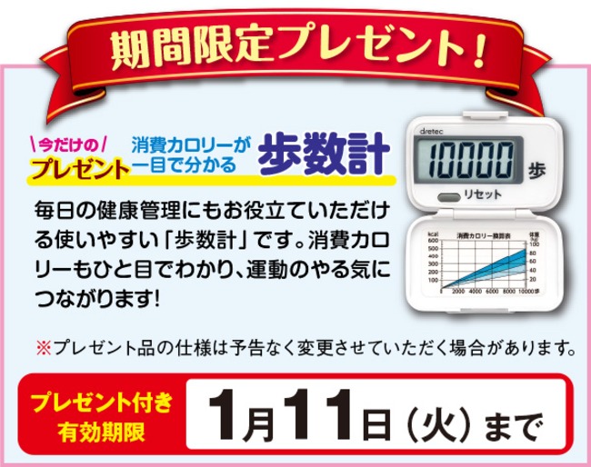 2022年1月11日(火)までのキャンペーン期間中にご購入いただくと、期間限定プレゼント「歩数計」を差し上げます。