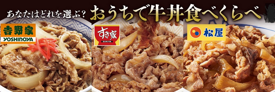 吉野家・松屋・すき家の牛丼を少量づつ一緒に購入できるので、食べ比べできます。