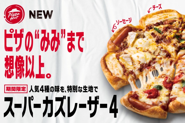 「スーパーカズレーザー4」は、人気を博した「カズレーザー4」がさらにパワーアップした新商品です。日本の宅配ピザチェーンの中で最初にピザの“みみ”にチーズやソーセージを入れたのはピザハット。