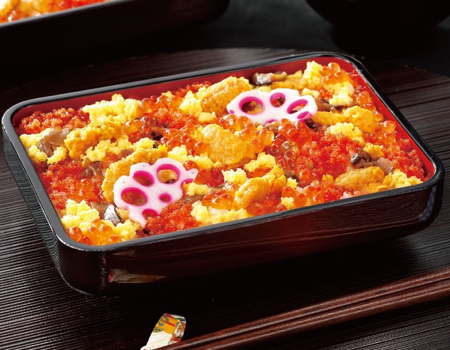 味付けいくら醤油漬け、味付ウニ、シシャモ子(ししゃもの卵)の豪華海鮮3種と、れんこんの酢漬けなど彩り鮮やかな具材3種を詰めた、見た目にも華やかな逸品。