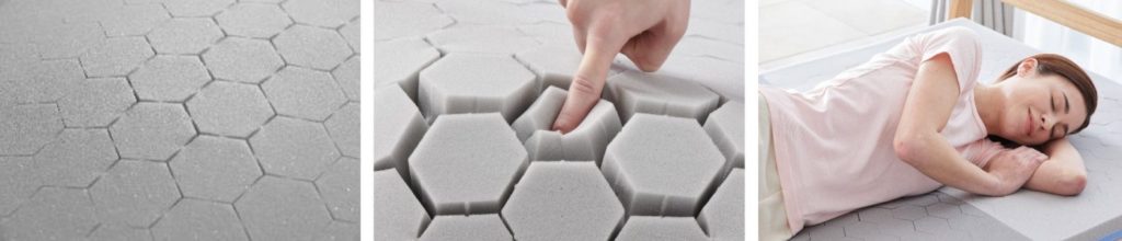さらに、マットレスの表面に独立して並ぶハニカムピラー(六角柱)が、体と寝具の隙間を埋めながら支えるので、優れた体圧分散性を実現。肩や腰の負担を軽減してラクに眠ることができます。